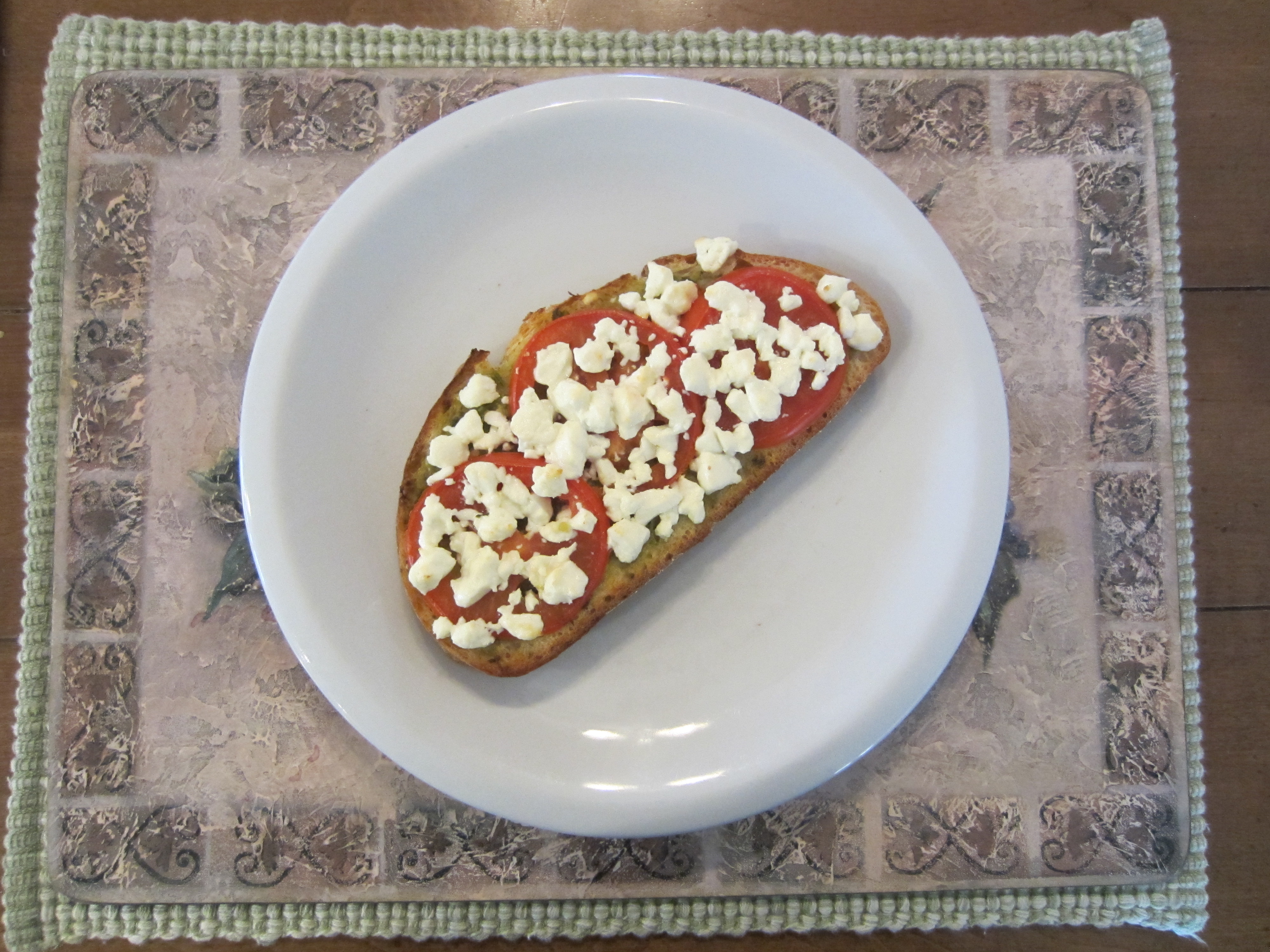 Spread pesto evenly on top of the bread, then lay tomato slices on top of pesto. Crumble goat cheese and sprinkle onto the tomato. Put in a toaster oven set at 415 degrees for 5 minutes.