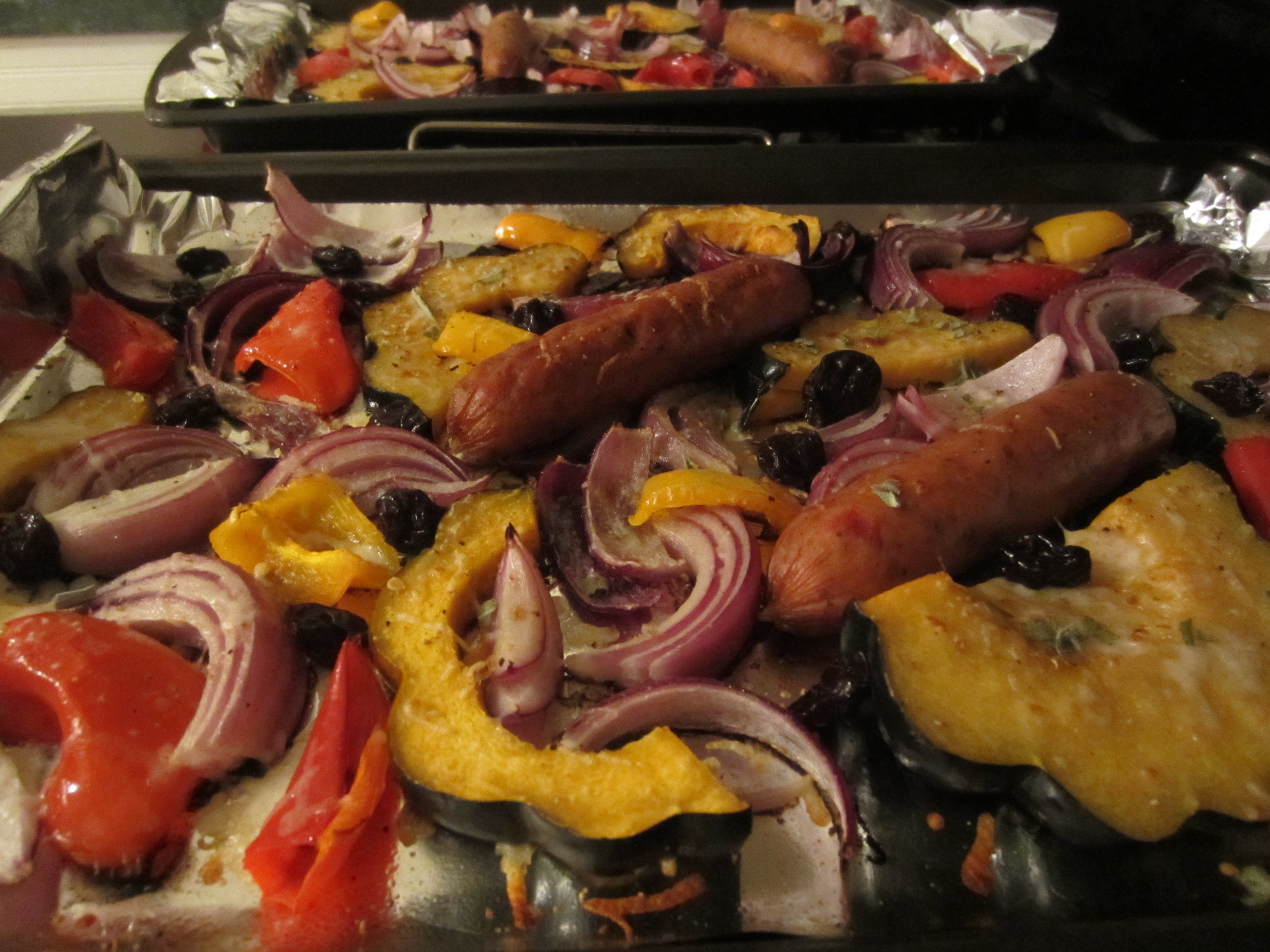 Yields: 4 servings of 1 sausage each, plus squash and vegetables
