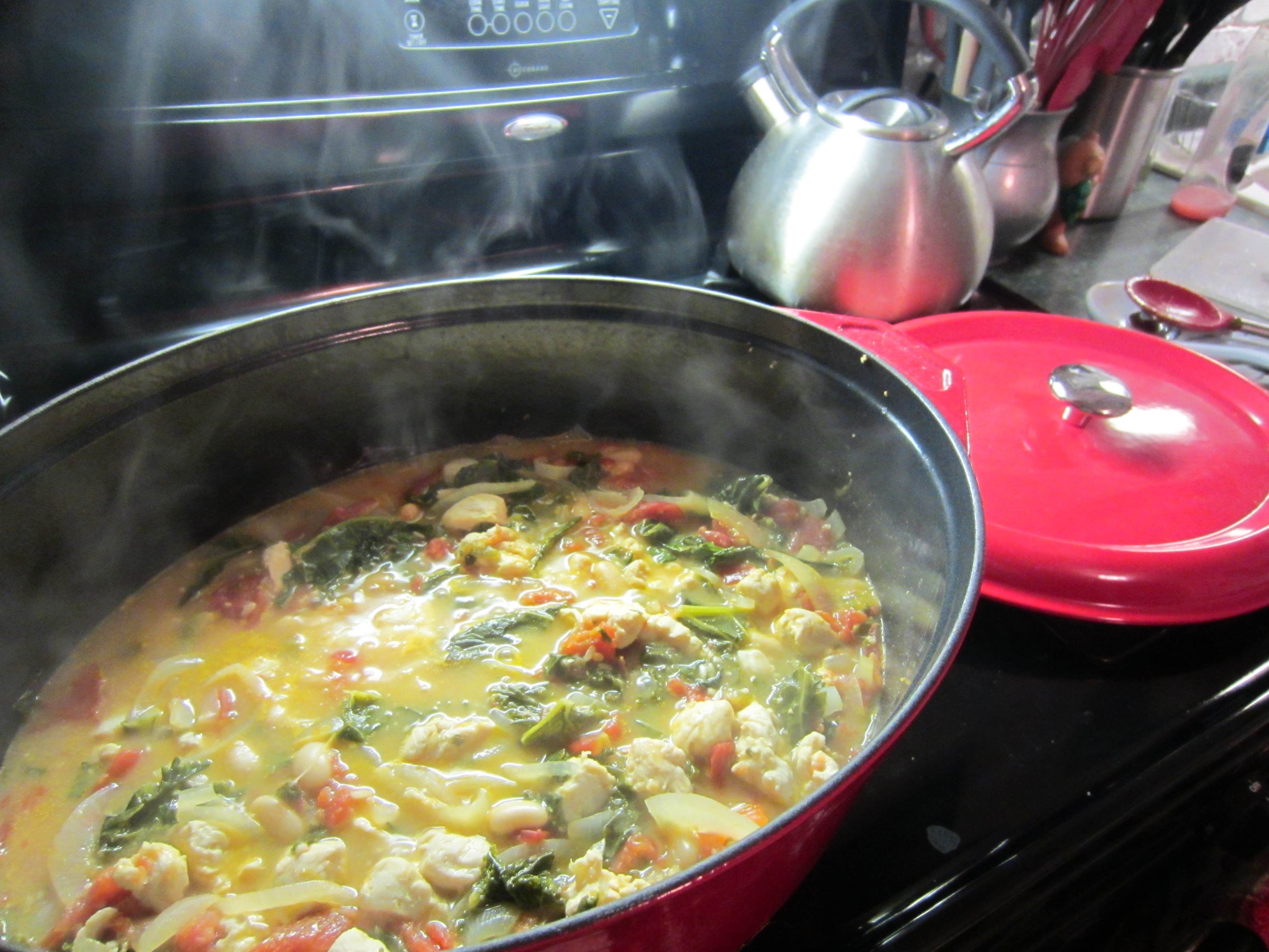 This is one of those hearty, delicious stews that’s wonderful on a cold night. However, I need to warn you…it’s very spicy. And with the combination of onions, kale, and white beans…