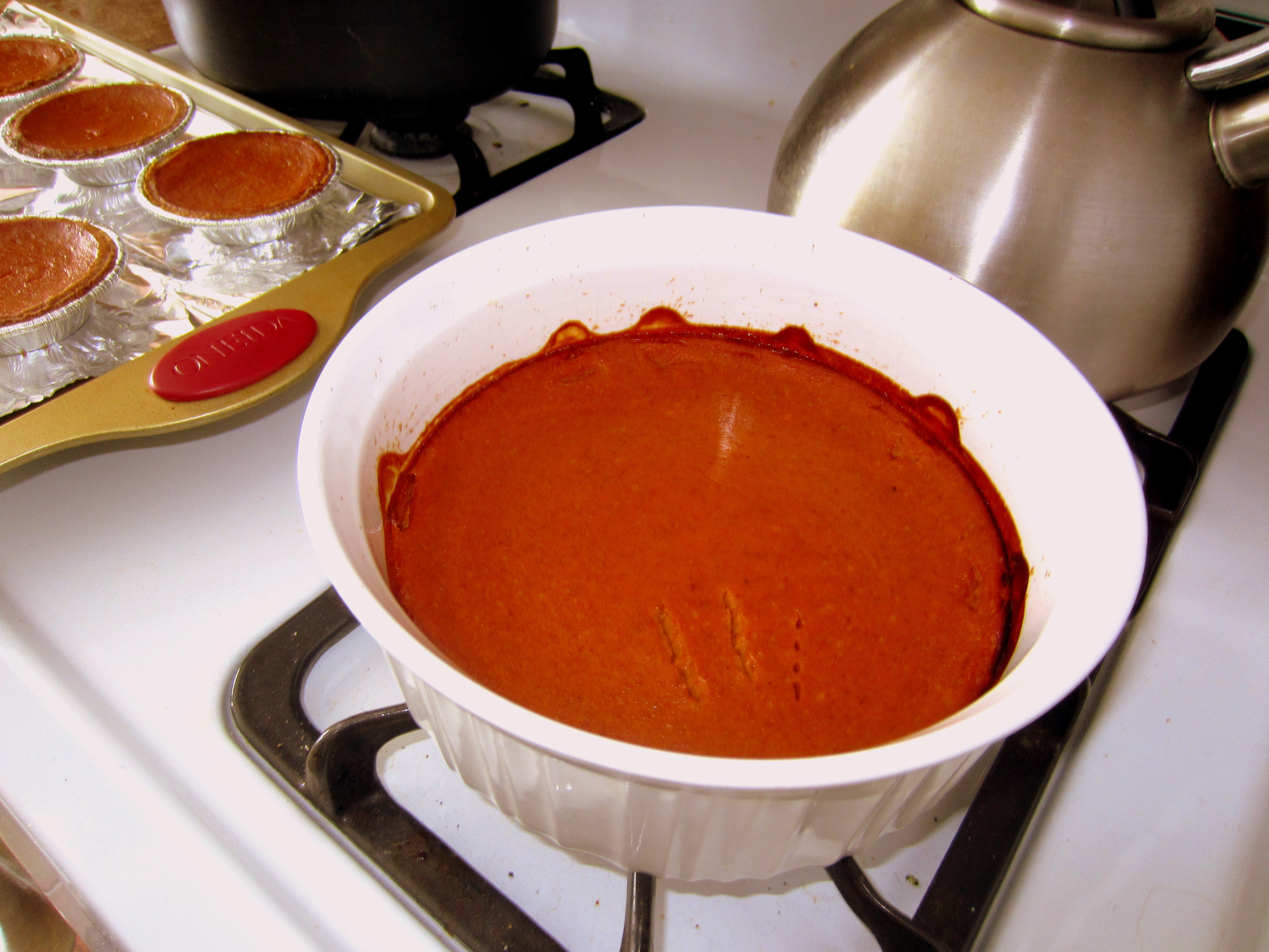 So you’ve got a couple of options here. Personally, I made 6 mini pies and poured the rest into a small corningware dish. The mini pies took considerably less time to cook than the latter, so make sure to give your pumpkin the good old fork test (prick it with a fork, and if it comes out clean, it’s done…if not, keep baking).