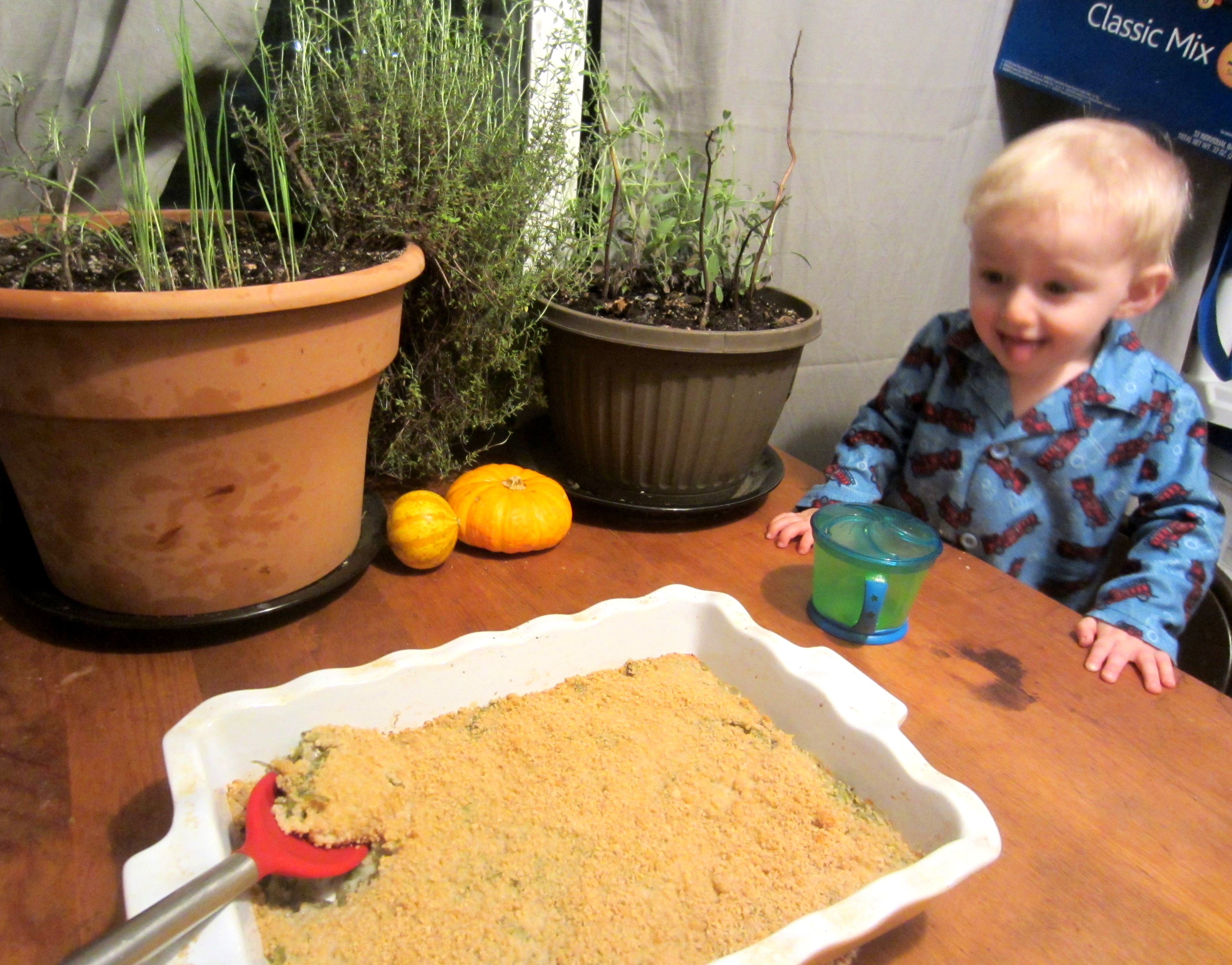 I went with panko bread crumbs with a touch of light butter, and that works, mostly. Since the casserole is a bit soupy (due to the fact that I use real soup instead of condensed soup), the topping isn’t quite as crispy as I would like. But it does come out delicious.